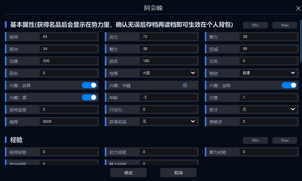 3.武将名品修改后,获得名品会显示在势力里,存档再读档可生效在个人背包。